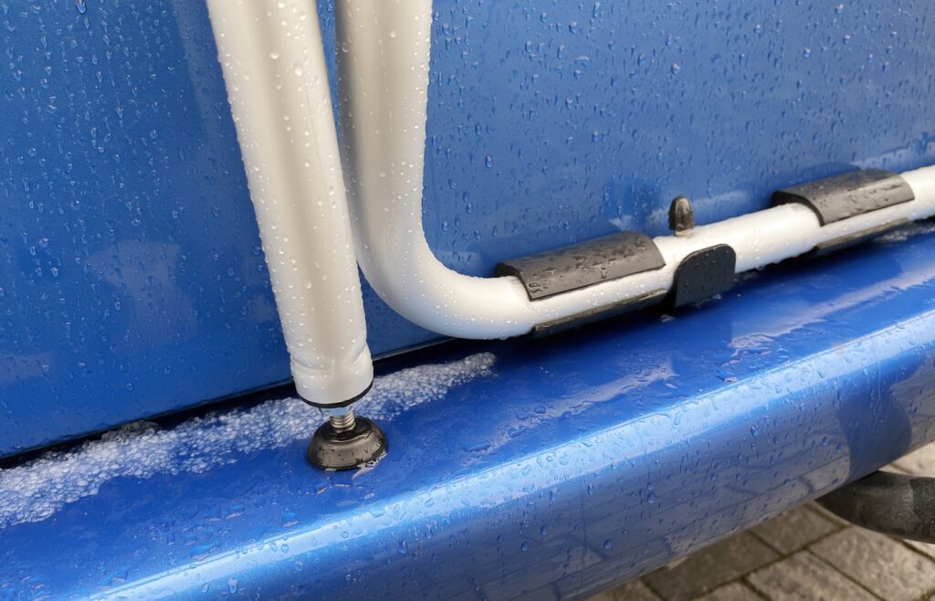 Mam hak, mam również bagażnik rowerowy na hak do osobówki, jednak po zamontowaniu tego bagażnika nie otworzę klapy z tyłu. Wiem, że istnieją adaptery przedłużające do haka jednak dość szybko stwierdziłem, że nie będę kombinował i kupiłem dedykowany bagażnik na klapę z Fiammy. Przy okazji montażu bagażnika rowerowego okazało się wprawdzie, że muszę również wymienić sprężyny gazowe w klapie, ale nie jest to ani skomplikowane, ani drogie. Oryginalne były o sile 830N i klapa zamykała się samoczynnie pod ciężarem bagażnika. Pewnie dlatego, że sprężyny miały już blisko 24 lata ale było to dość uciążliwe. Wprawdzie daliśmy radę objechać w ten sposób jedną trasę, ale zaraz po powrocie zamówiłem nowe o sile 910N. 10 minut roboty i klapa trzyma się sama 🙂