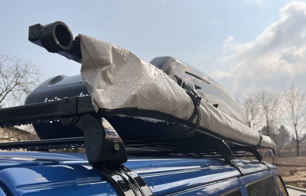 Wymyśliłem sobie markizę montowaną na bagażniku. Nie w kasecie przykręcanej do karoserii jak w przypadku rozwiązań Thule czy Fiamma tylko w pokrowcu montowanym właśnie do bagażnika. Ma ona dwa zasadnicze atuty. Cena i brak dziur w karoserii. Takie markizy sprzedaje bielska Cortima. Latem zapewne będę mógł coś więcej powiedzieć na ten tamat ponieważ na razie nie było jeszcze okazji sprawdzić jej praktycznie w terenie. Adapter z pokrowcem jest długi na 260 cm, natomiast sama markiza ma 245 cm na 212 cm.